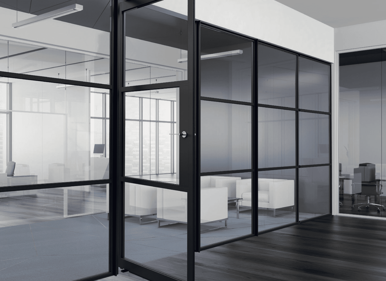 The system is available as fixed screens, single and double hinged doors, pivot doors and sliding configurations, making it suitable for everything from home offices and kitchens to living spaces and commercial interiors.